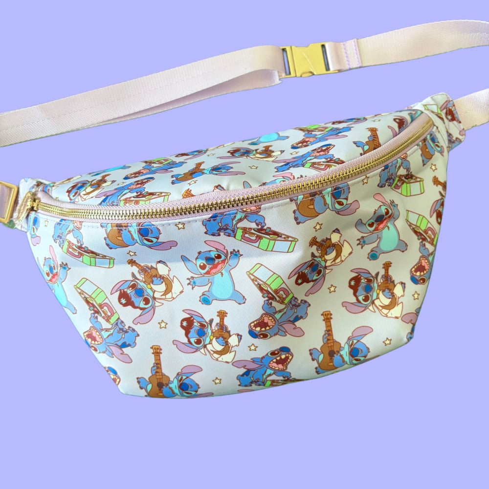 This high-quality, waterproof, scratch-resistant belt bag is perfect for theme parks. It features a baby blue exterior with a matching zipper and belt. The interior is lined in turquoise and includes a zippered pocket. The bag is finished with gold hardware accents.